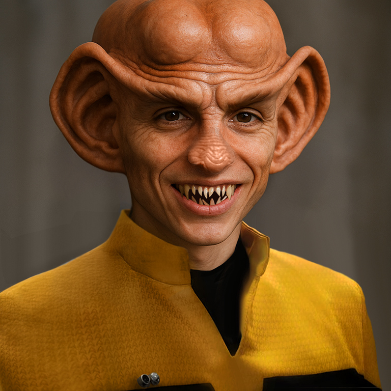 | Physical Description | Bek is a fairly typical Ferengi in terms of stature- shorter than most species, and built in a scrappy but scrawny way. His skin is a pumpkin-like shade of orange-tan and has a hairless, thick texture. His ears seem about typical of a Ferengi male, his forehead the multi-lobed, almost grub-like shape as standard. His ridged nose is large, long and bulbous, similar to a head of garlic. Bek’s eyes are large and brown in color, lacking the sense of grasping intelligence that some Ferengi have, but seem shrewd and… mischievous? Bek’s smile is a frequent greeting to those who engage him, and his mouth is full of typically sharp and jagged teeth which he proudly keeps sharpened. Bek has an overbite and when he smiles closed-lips a few tips of his fangs still rest against his bottom lip. His nails are prismatic. |